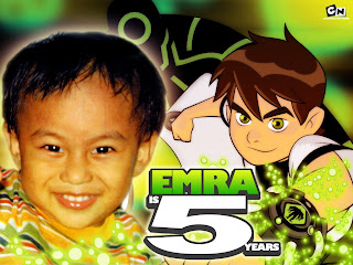 Emra Ultah hari ini, selamat ultah ya nak, doa kami selalu yang terbaik untukmu. Juga buat oma (ibuku) yang ultahnya juga bareng ma Emra. Komplit cerita Emra ultah ada disini. Ga ada photo cake emra yg bagus. Emang sibuk grasak-grusuk ga kepikiran deh. Boneka Ben10 jadi rebutan, itu cake kecolek-colek...lucu liat tingkah anak-anak itu. Ini poto untuk cover/edible cakenya emra.